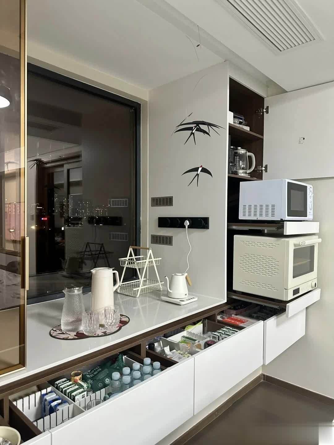 放弃传统笨重的餐边柜,直接把飘窗改成抽拉高柜,小家电、餐具、杂物全都能收纳进去,台面还能当备餐区。
