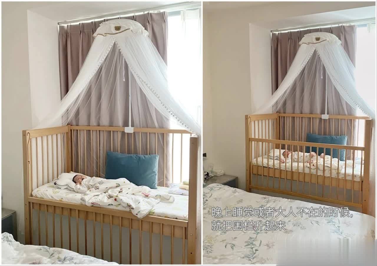 有业主直接把飘窗改造为独立婴儿床,位置刚好挨着大床,夜里喂奶、照看宝宝特别方便。