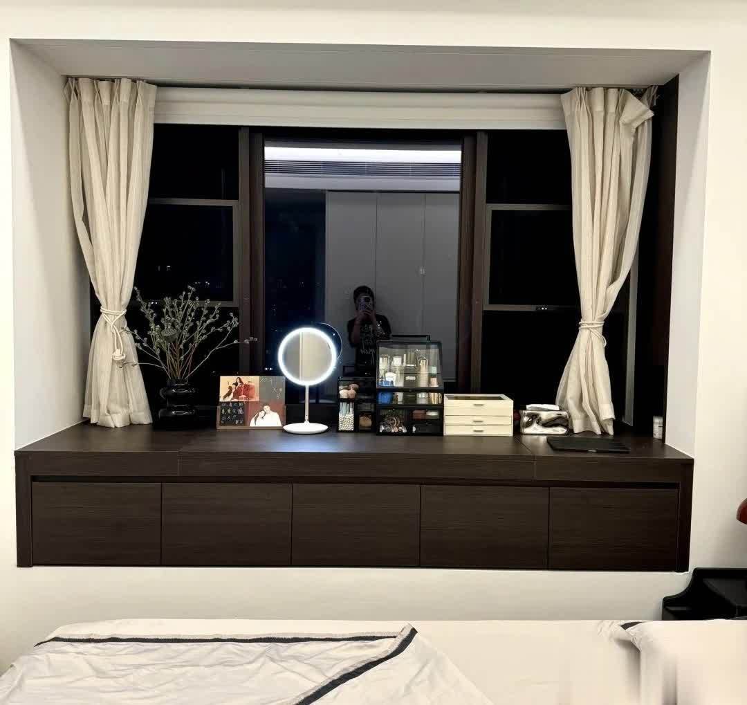 可以做抽拉式梳妆台,平时隐藏在飘窗内,使用时轻轻拉出,坐在床上就能化妆、护肤,不占额外空间。