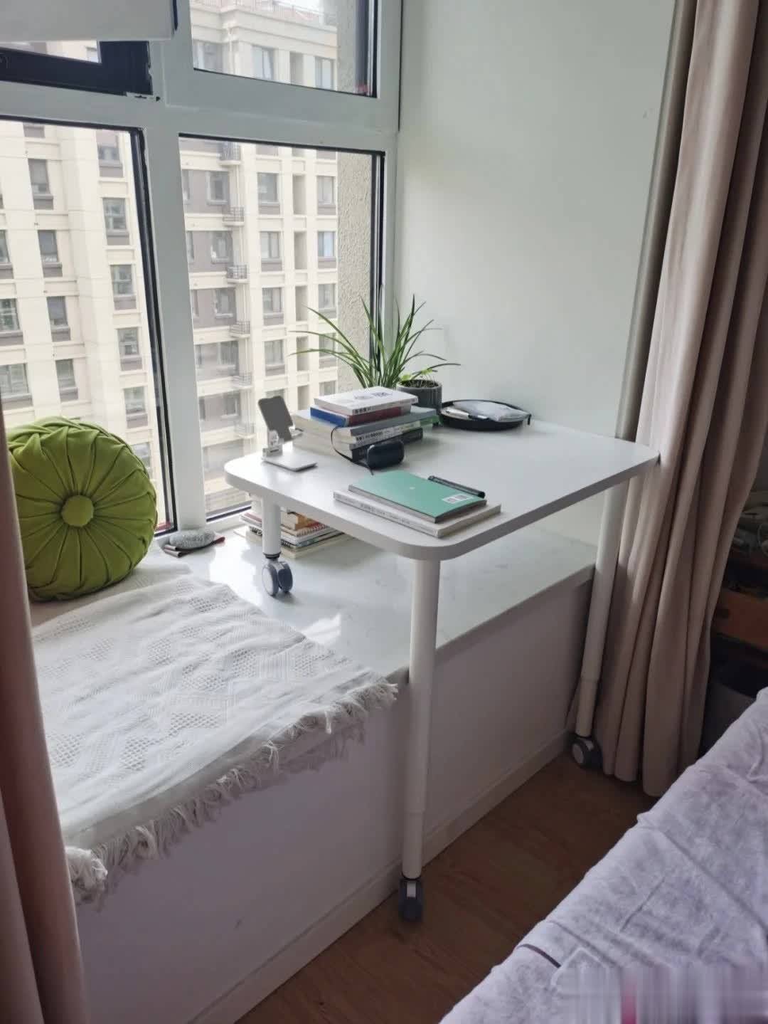 现在流行的可移动飘窗书桌,完美解决这个问题。不用的时候推进去,完全不影响走路、开窗;需要办公、化妆、看书时拉出来,高度适中,不用蜷着腿、抵着腰,久坐也舒服。