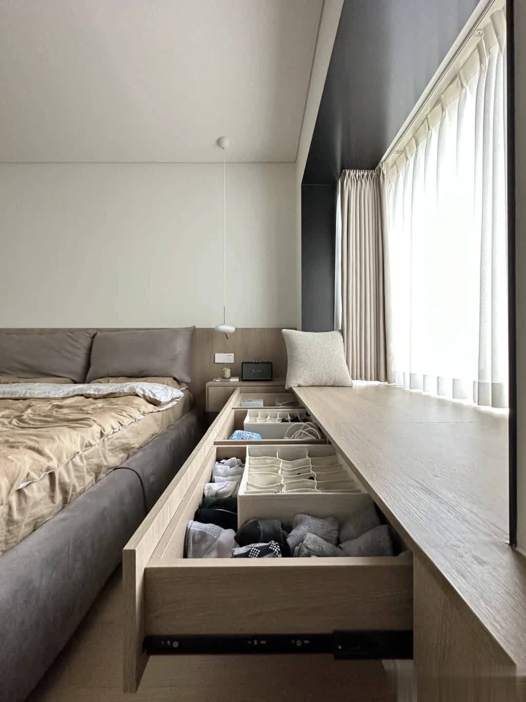 还有人直接在飘窗台加装抽屉,专门收纳内衣、袜子、杂物,起床随手就能拿,动线超合理。