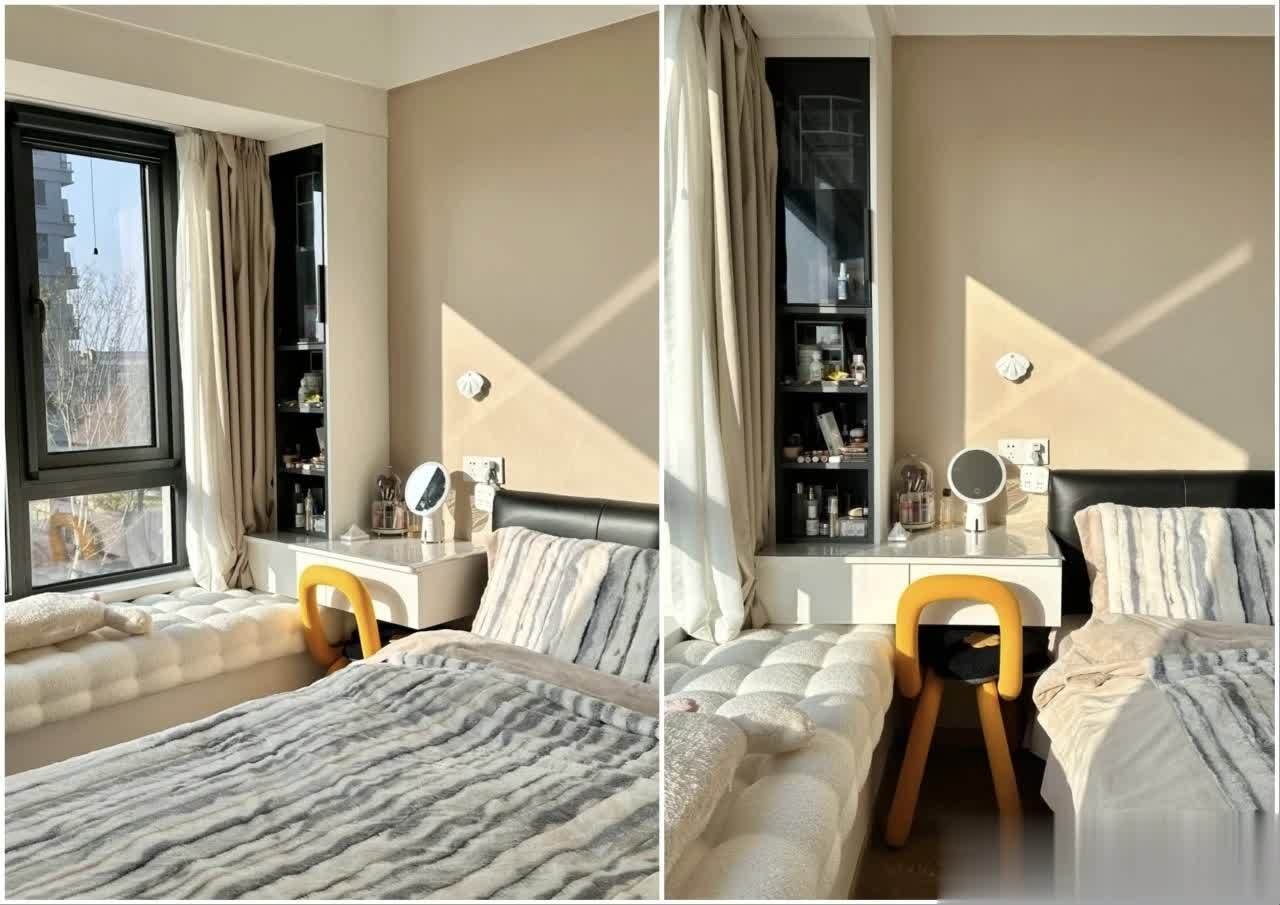 如果想保留飘窗的休闲感,也可以做成一体式飘窗梳妆台,旁边再搭配悬浮床头柜,视觉上连贯统一,颜值和实用同时拉满。
