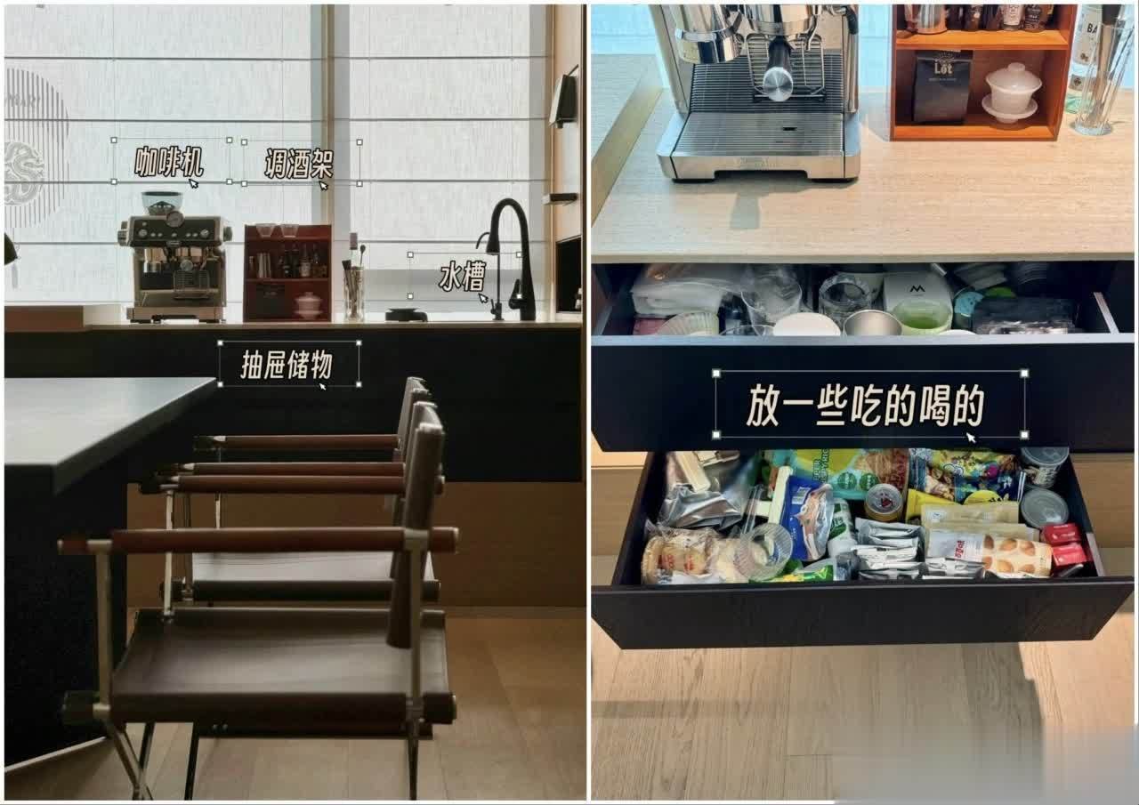 餐厅区域可以做成氛围感茶水吧,能收纳、能清洁,颜值高又实用;